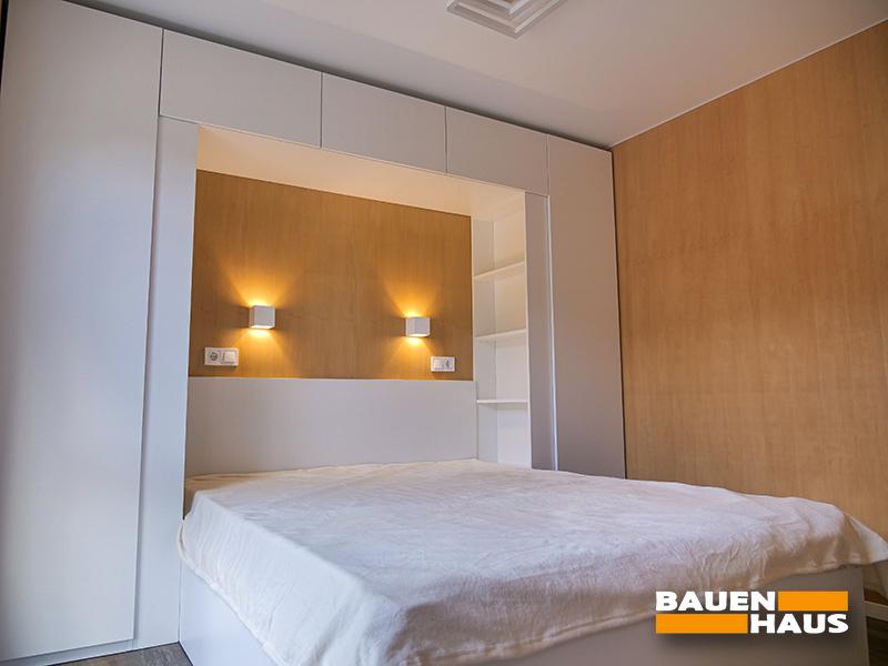 Спальня також у приємних теплих відтінках площею 9 м². Натяжні стелі – білі, матові. Люстра з дистанційним пультом. Приміщення прямокутної форми, що добре сприймається візуально, а також є зручним у плані розставлення меблів.