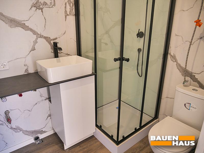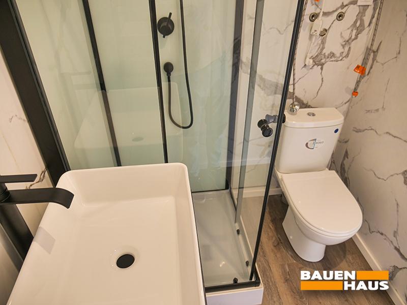 І, нарешті, санвузол який у свою невелику площу в 3,3 м² вміщує, душову кабіну, бойлер, умивальник, унітаз, та навіть місце для пральної машини. Стіни з SPC плити з імітацією під мармур.