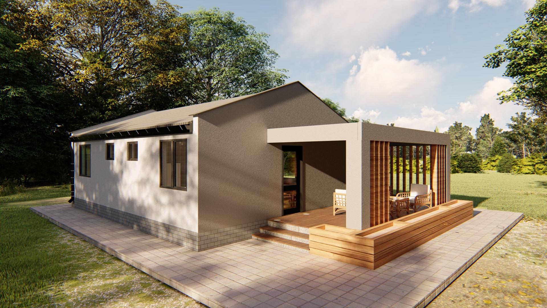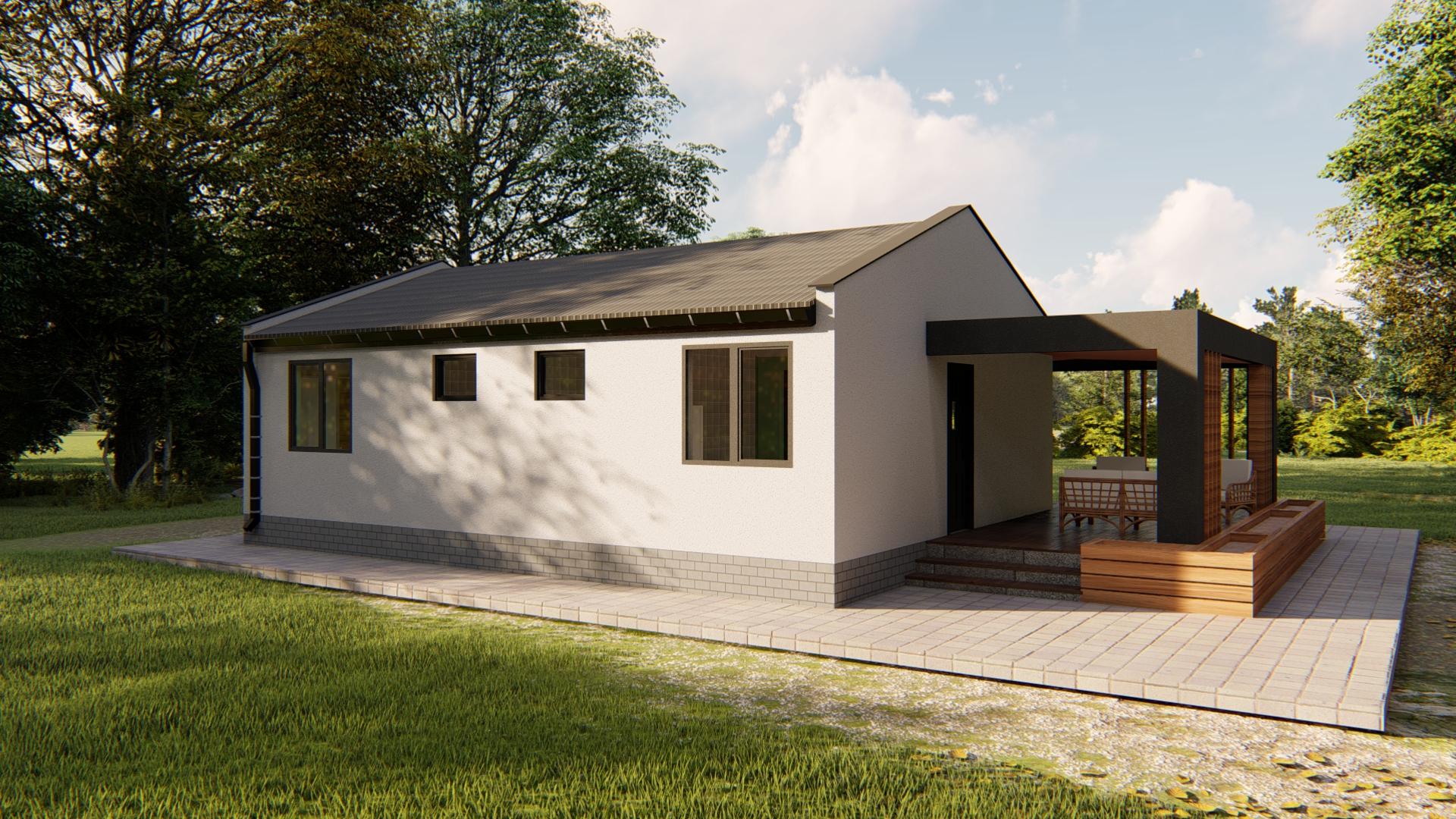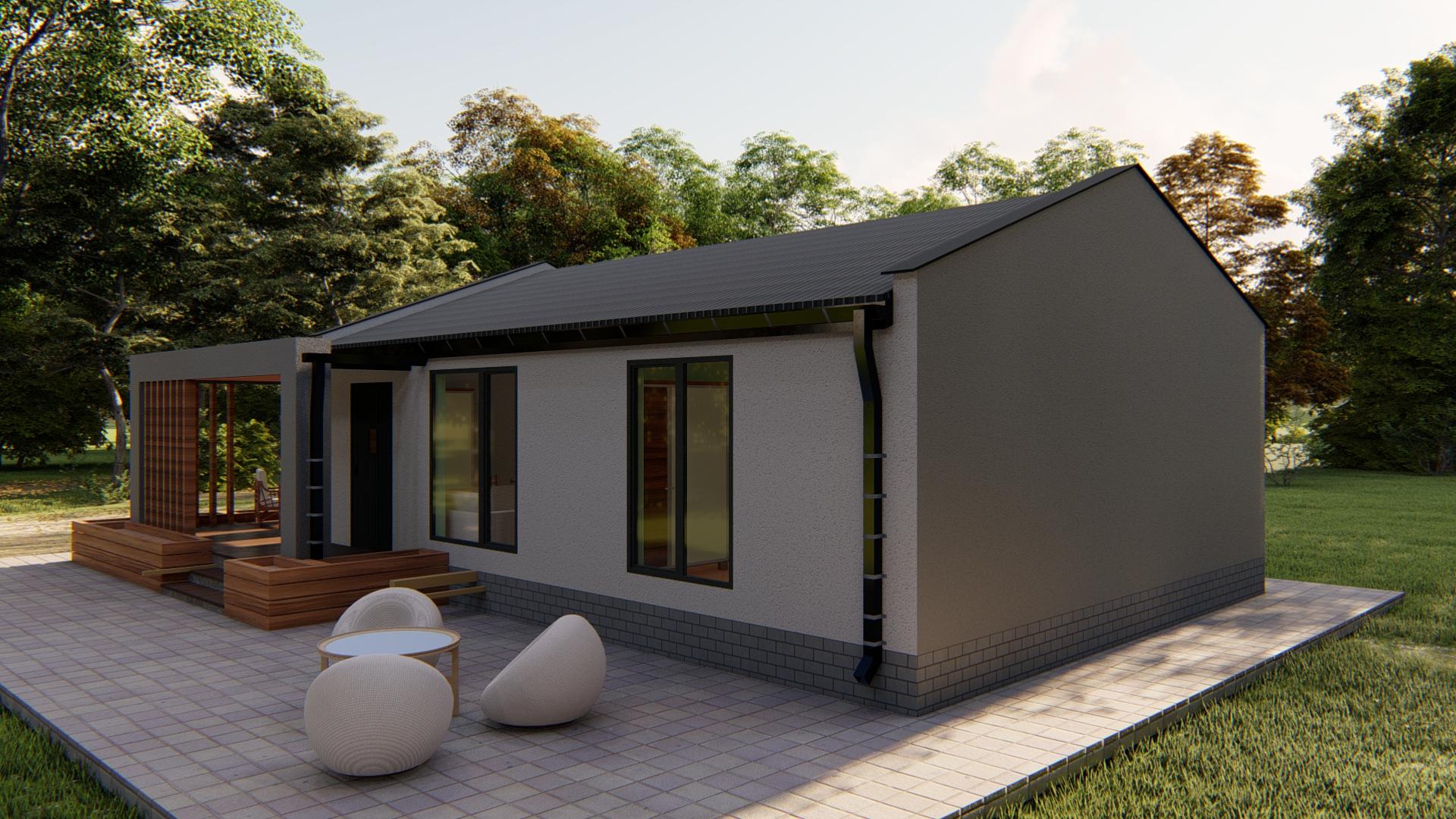 Представляємо новий проєкт одноповерхового будинку, спроєктованого під використання СІП панелей у будівництві. Загальна площа цього будинку становить 63 квадратних метри. Планування будинку містить кухню, вітальню, дві окремі спальні, санвузол, топкову та терасу.