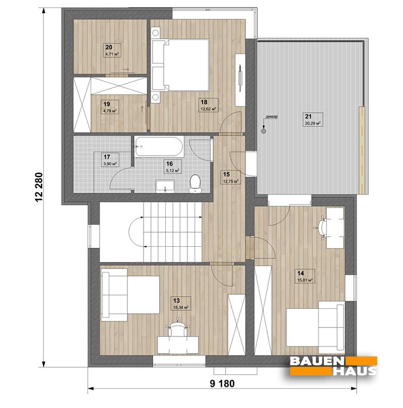 - Домокомплект: Зовнішні стіни – СІП 160 мм; Дах – СІП 200 мм; Перегородки несучі – каркасні; Міжповерхове перекриття – каркасне з настилу з ОСП-22 мм;