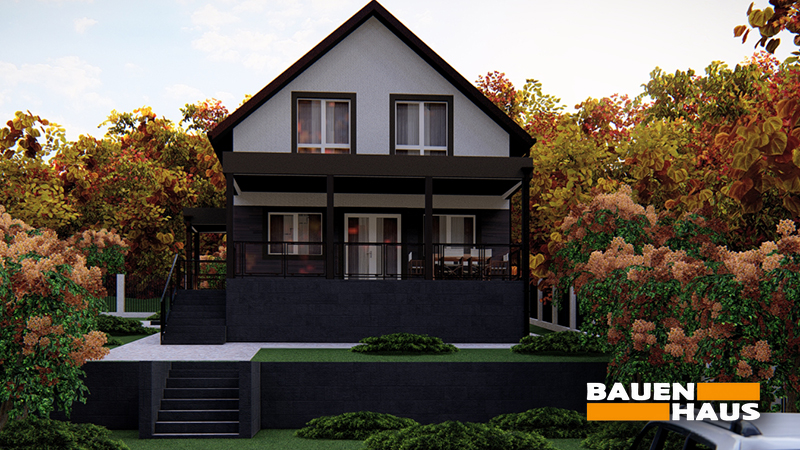 Фасад будинку вирізняється лаконічністю та контрастним поєднанням світлих і темних відтінків. Відкрита тераса з навісом та прямим виходом у двір підкреслює заміський характер проєкту.