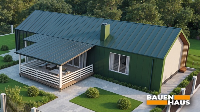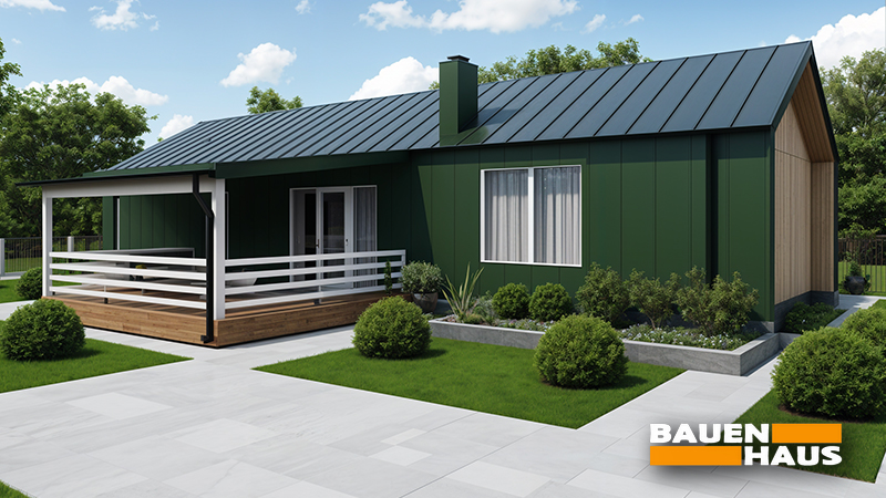 Проєкт «Стеценка» – канадський будинок площею 91 м² з великою терасою та продуманим плануванням в одному рівні. Фасади поєднують вертикальне металеве облицювання насиченого зеленого кольору з дерев’яними вставками та штукатуркою торцевої стіни. Двосхилий дах з металевим покриттям і накрита тераса формують стриманий, але виразний силует будинку.