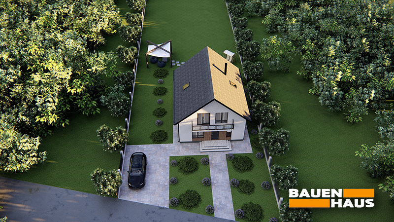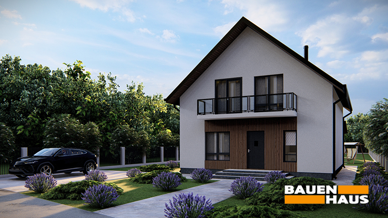 Проєкт «Туліп» – це двоповерховий мансардний будинок із продуманим плануванням та сучасним зовнішнім виглядом. Фасади поєднують світлу штукатурку з акцентами під дерево, що створює стриманий і гармонійний образ. Завдяки великому балкону та просторій терасі будинок має зручні зони для відпочинку на свіжому повітрі.
