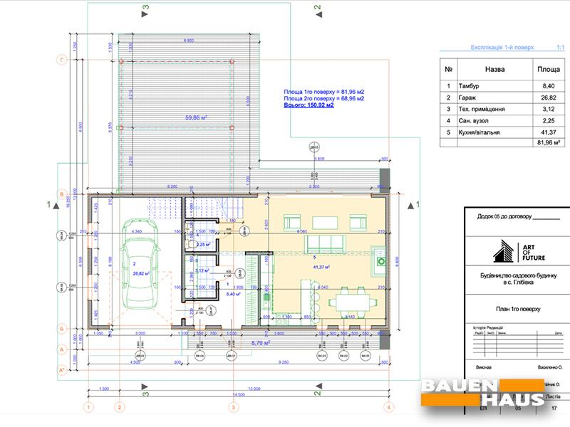 На першому поверсі розташовано гараж для автомобіля, що додає зручності та комфорту. Велика тераса ідеально підходить для зустрічей з друзями та родиною, а гостьова зона, що об’єднана з кухнею та столовою, створює гармонійне та привітне середовище для сімейних обідів та вечерь.