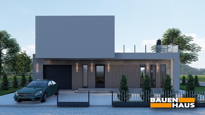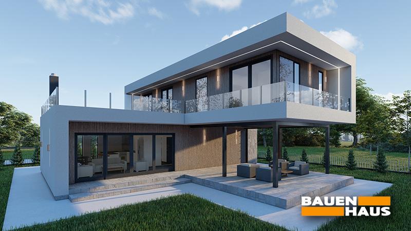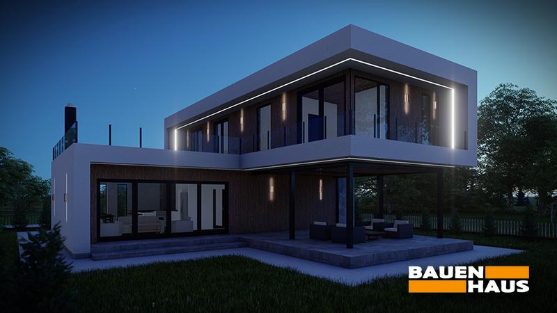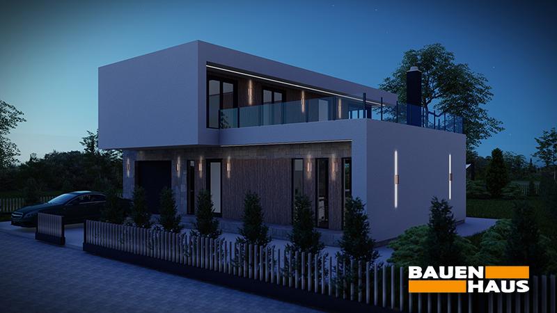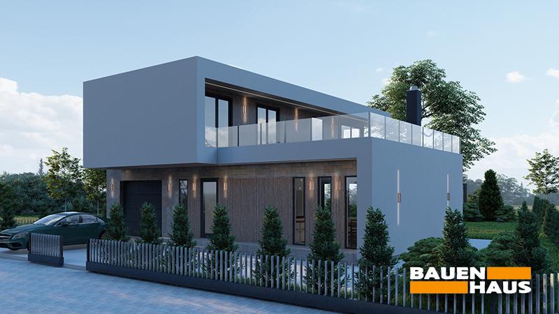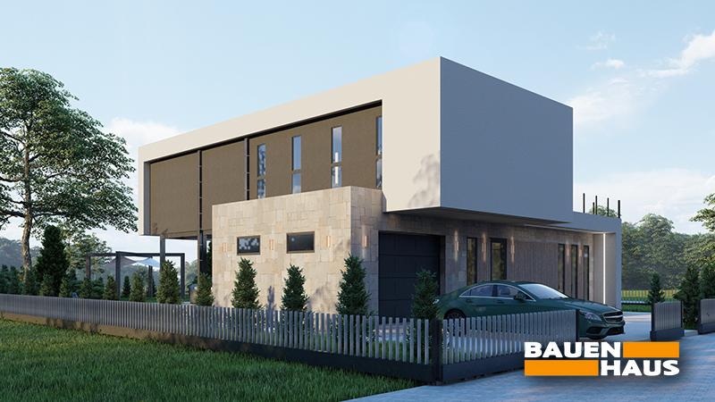 Проєкт цього будинку з СІП панелей в стилі модерн загальною площею 151 м2. Великі вікна, що охоплюють обидва поверхи, забезпечують максимальне проникнення природного світла та створюють враження поєднання зовнішнього та внутрішнього просторів.