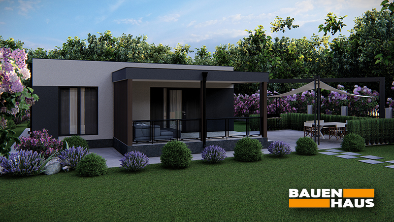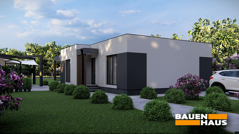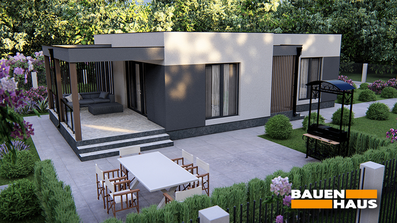 Компактний одноповерховий будинок з двома спальнями, просторою кухнею-вітальнею та терасою для відпочинку. Загальна площа – 76,8 м², з яких 26,2 м² займають житлові кімнати. Завдяки функціональному плануванню, у будинку передбачено дві ванні кімнати, технічне приміщення та коридор, що з’єднує всі зони.